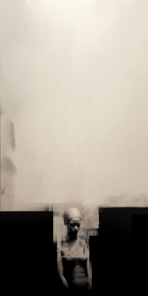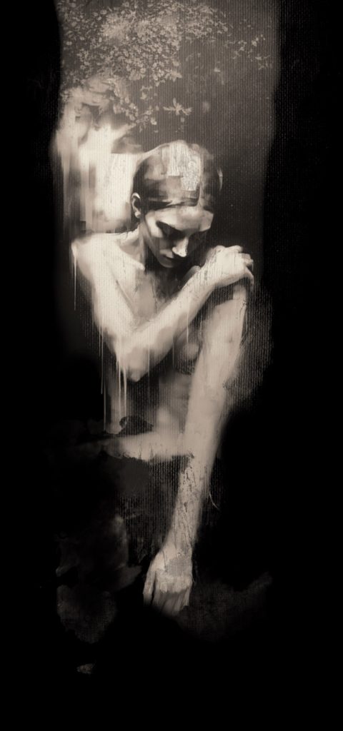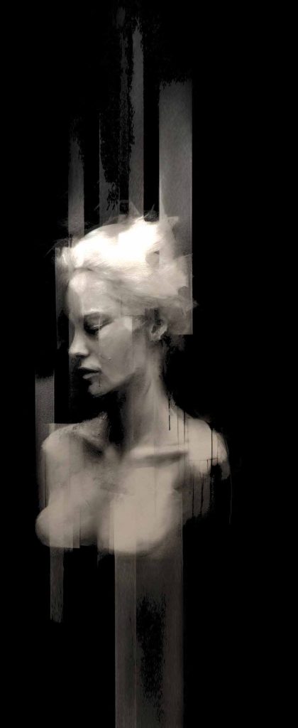 Un ejercicio plástico desarrollado con una sorprendente sensibilidad en el que fusiona con elegancia el arte digital con dibujos a mano de gran destreza e intervenciones con resinas para expresar la danza constante entre sus emociones, miedos y esperanzas mostrando su mente en diferentes escenarios de reflexión y meditación.