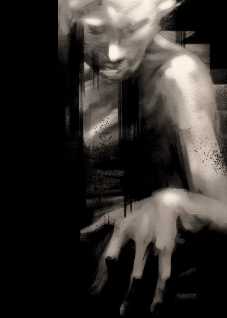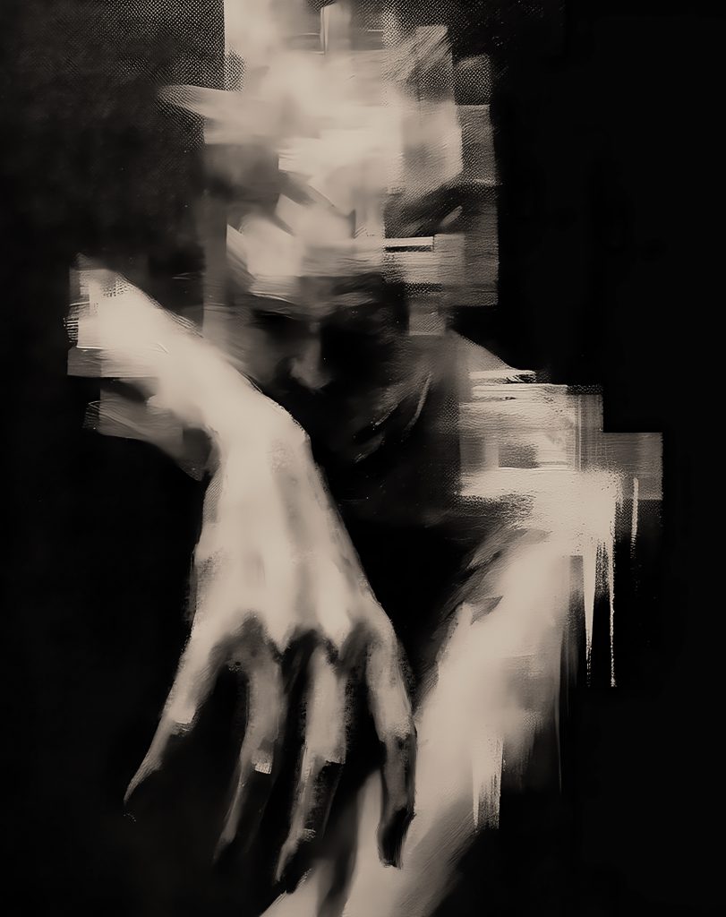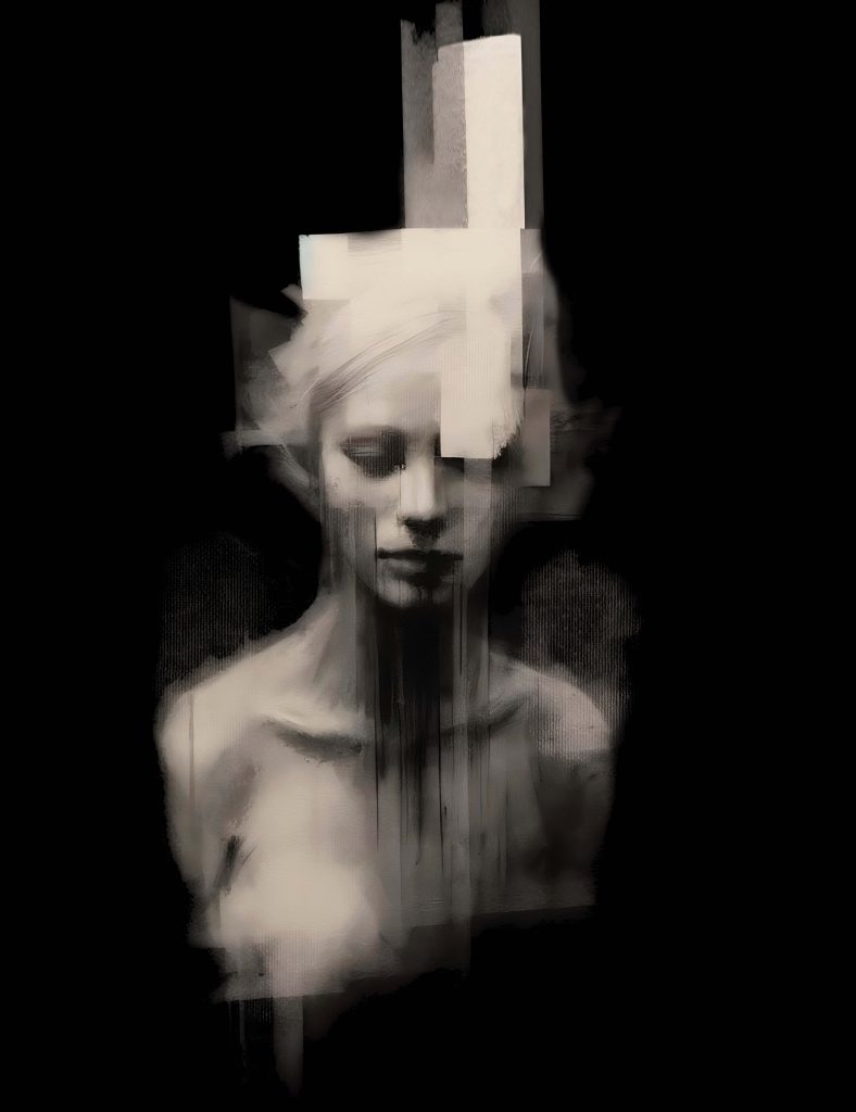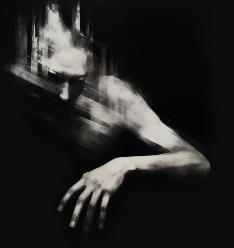 En su obra, la negrura no solo es un elemento estético, sino también un símbolo de este espacio interior. Sus pinturas capturan la esencia de la meditación al representar la mente inmersa en la oscuridad, como si estuviera sumergida en las profundidades de la conciencia. A través de los claroscuros, revela destellos de luz que simbolizan la iluminación y la comprensión que surgen de la introspección.